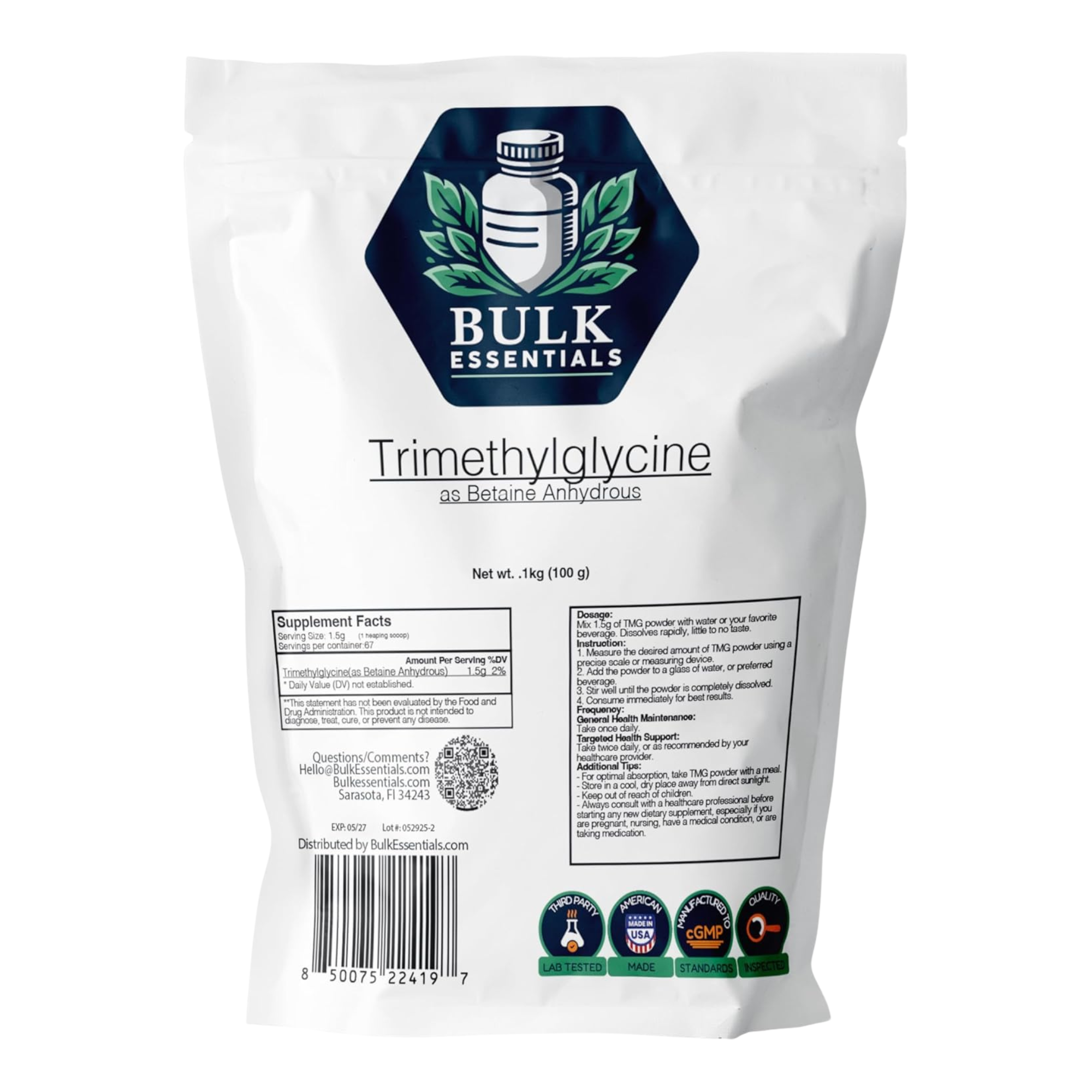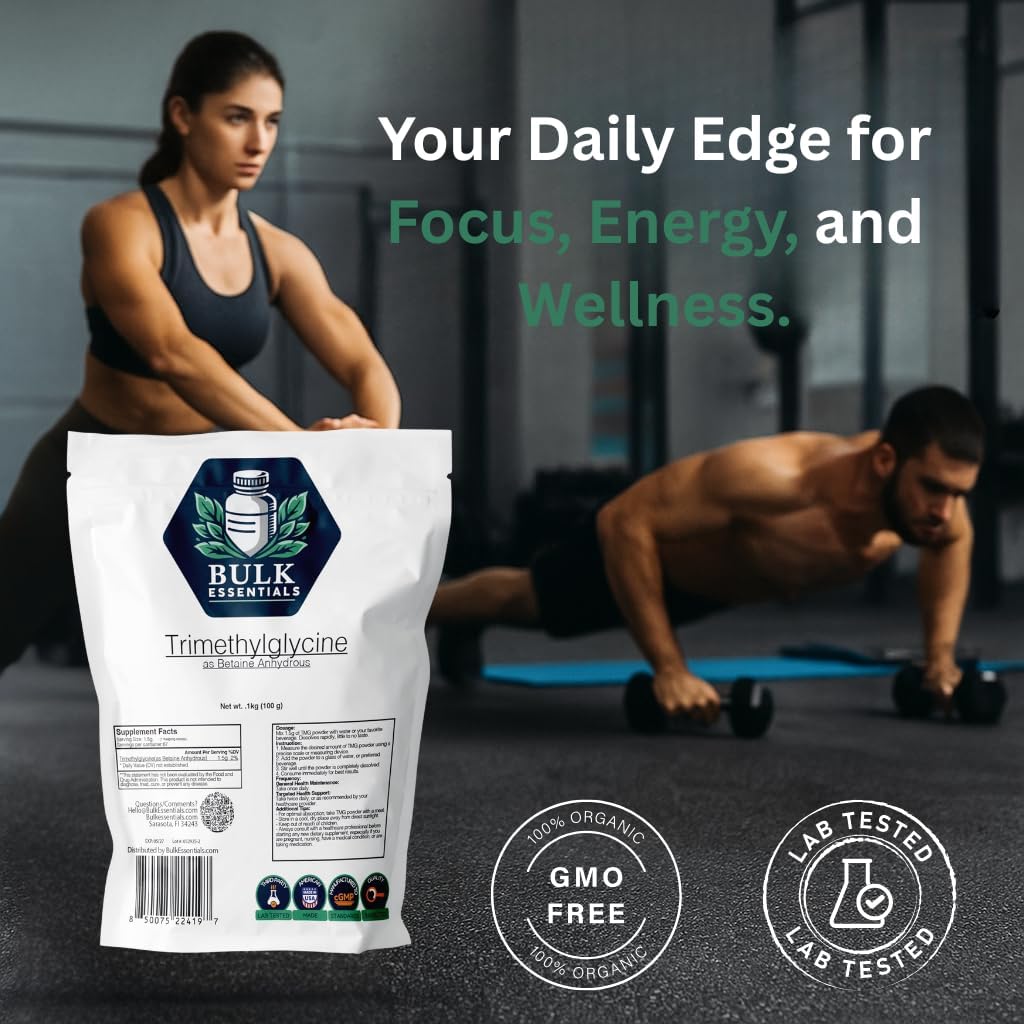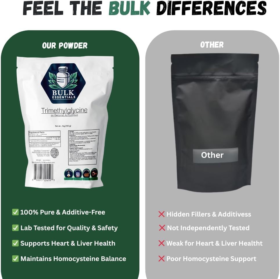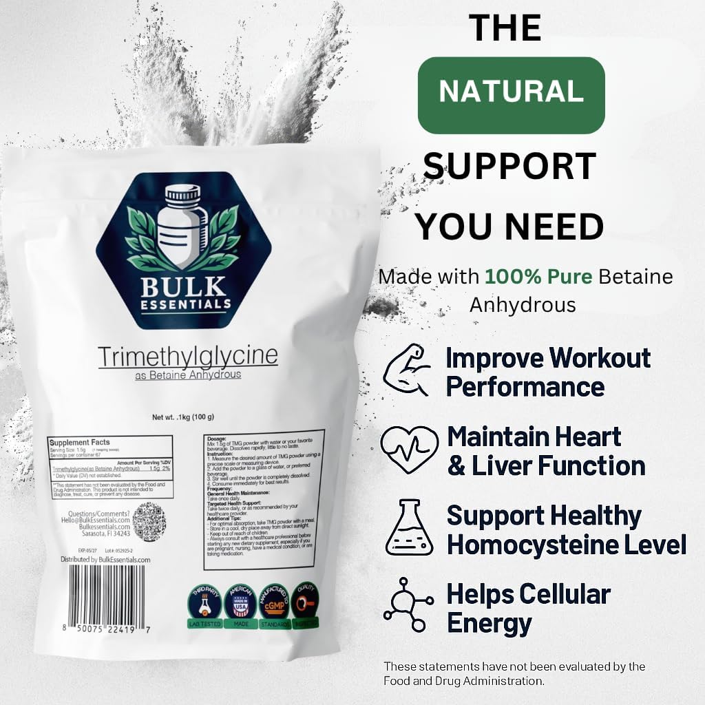 Bulk Essentials TMG Trimethylglycine Powder is a premium, high-quality supplement designed to support healthy homocysteine levels and overall well-being. Each serving provides 1.5g of pure Betaine Anhydrous, a naturally occurring compound that plays a key role in supporting balanced health.