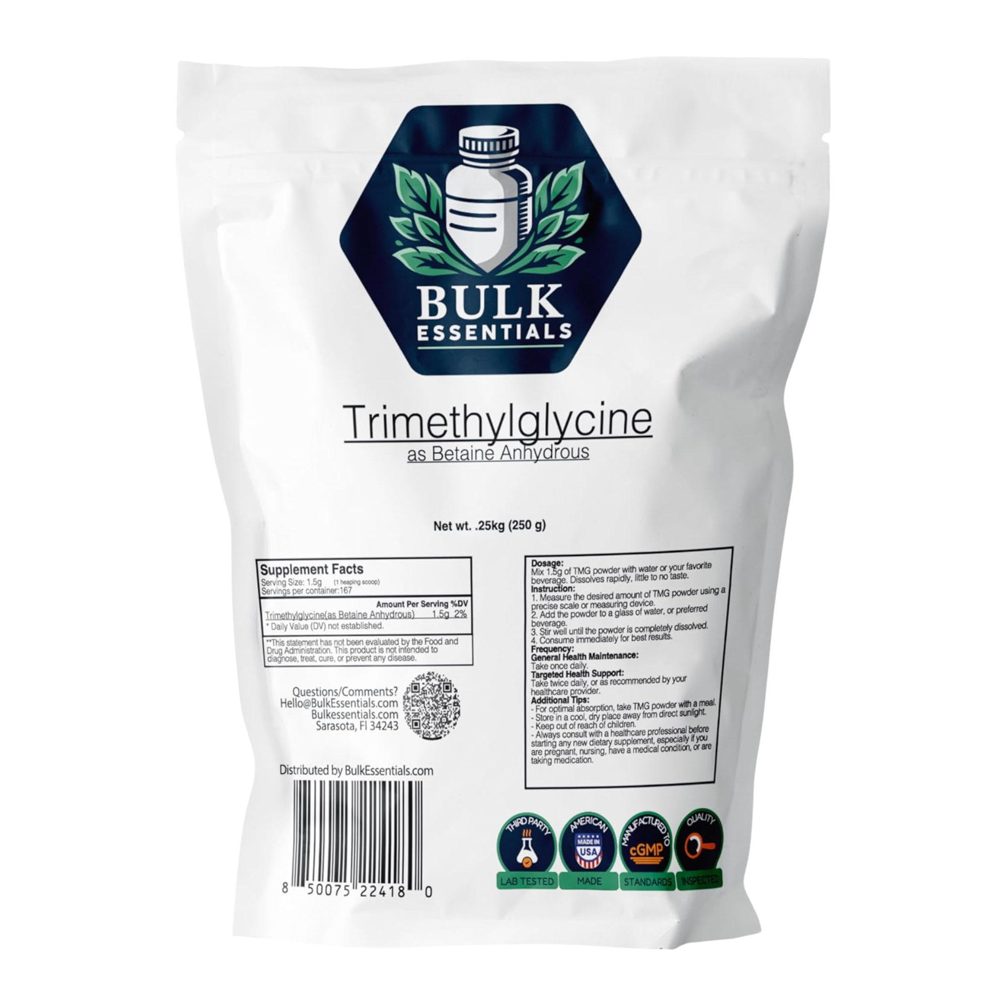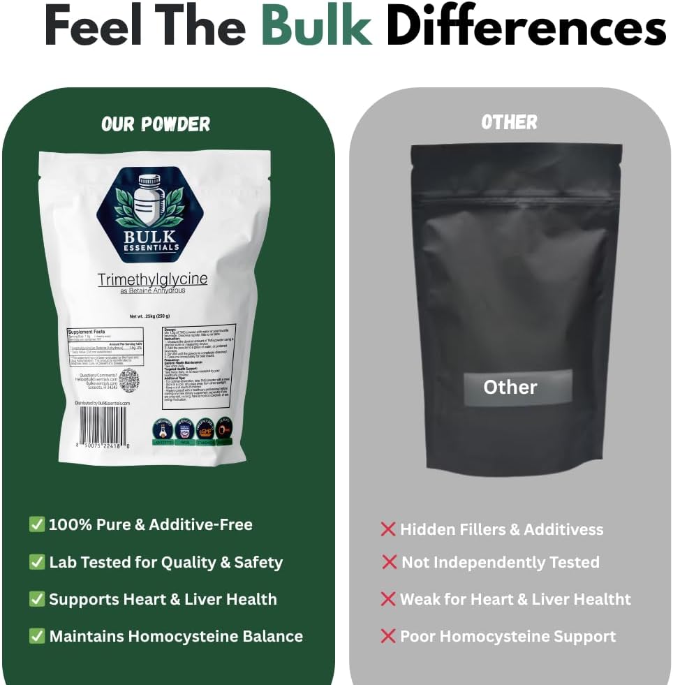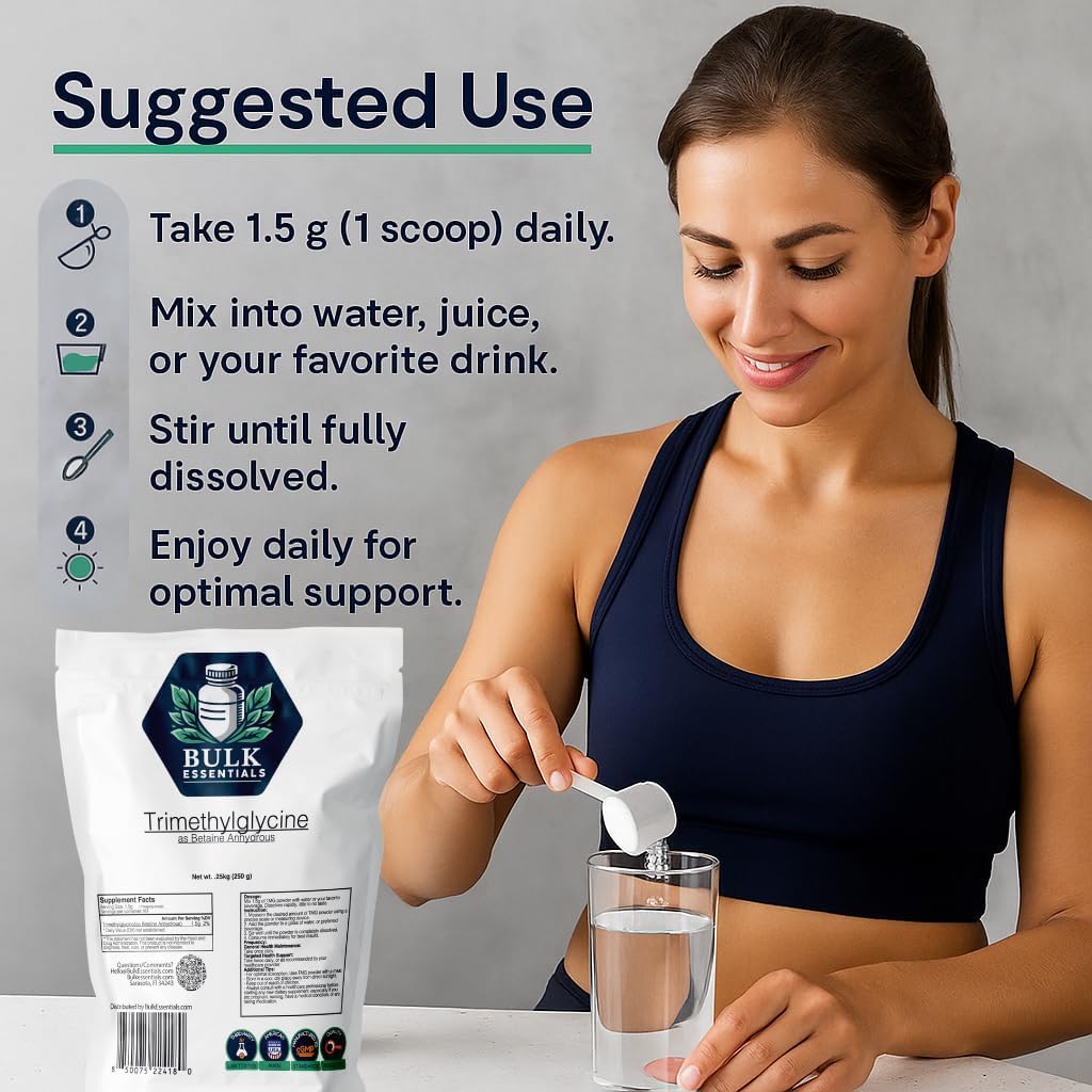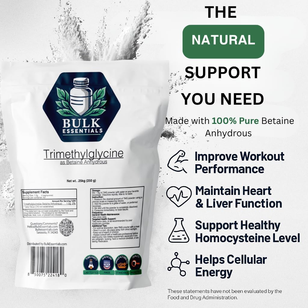 Bulk Essentials TMG Trimethylglycine Powder is a premium, high-quality supplement designed to support healthy homocysteine levels and overall well-being. Each serving provides 1.5g of pure Betaine Anhydrous, a naturally occurring compound that plays a key role in supporting balanced health.